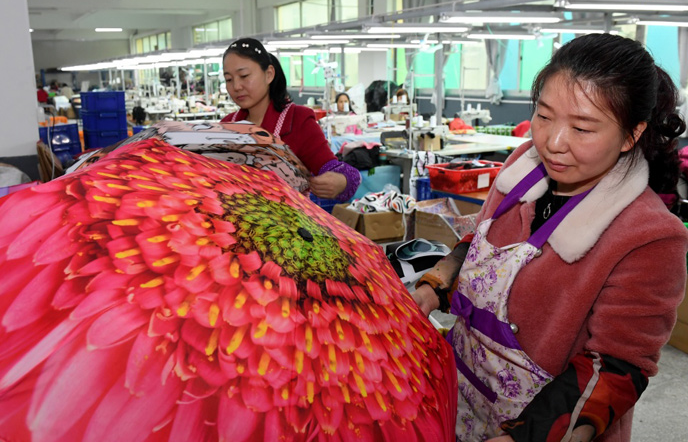 2月20日,莆田一家電子商務(wù)有限公司的工人檢查外銷(xiāo)個(gè)性化定制雨傘質(zhì)量。
