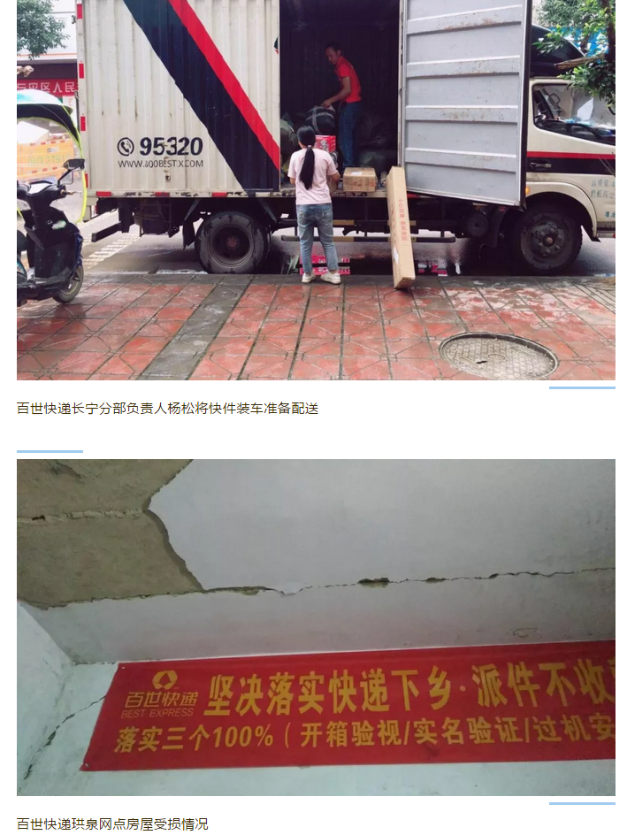 百世快遞重慶分公司網(wǎng)管介紹到,個(gè)別鄉(xiāng)鎮(zhèn)因道路交通受阻,目前有少量快件積壓無法派送,但宜賓市區(qū)及其他地區(qū)的網(wǎng)點(diǎn)運(yùn)營和快件的派送仍正常進(jìn)行。其中,長寧縣除梅垌鎮(zhèn)、富興鄉(xiāng)、雙河鎮(zhèn)3個(gè)受災(zāi)重區(qū),其余15個(gè)鄉(xiāng)鎮(zhèn)均能夠正常派送快件且無快件受損,個(gè)別鄉(xiāng)村道路路面因山體滑坡被掩蓋,預(yù)計(jì)今明兩天疏通。