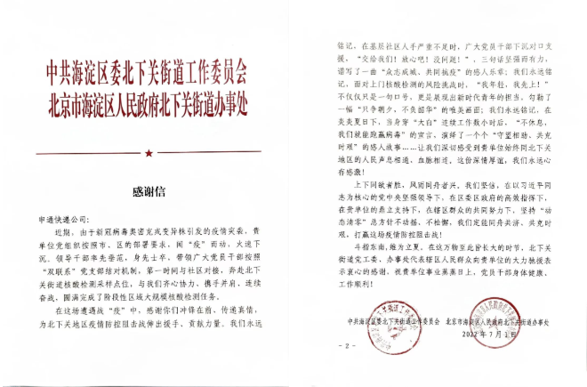 2022年07月04日來(lái)源:申通之聲7月1日建黨節(jié)當(dāng)天,申通快遞北京北下關(guān)網(wǎng)點(diǎn)收到了一份感謝信。