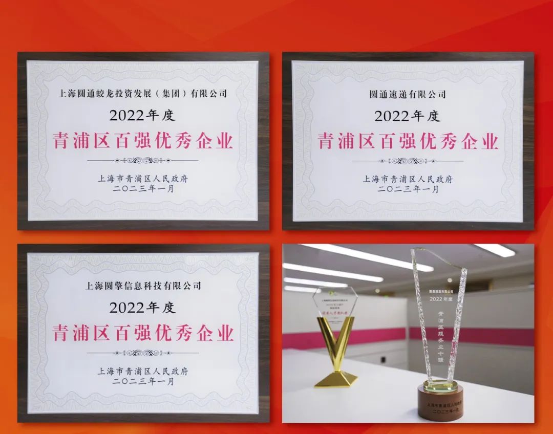 表彰會(huì)上,上海圓通蛟龍投資發(fā)展(集團(tuán))有限公司、圓通速遞有限公司、上海圓擎信息科技有限公司榮獲“2022年度上海市青浦區(qū)百?gòu)?qiáng)優(yōu)秀企業(yè)”,圓通速遞有限公司榮獲“2022年度青浦區(qū)服務(wù)業(yè)十強(qiáng)企業(yè)”,上海圓擎信息科技有限公司榮獲“2022年度青浦區(qū)創(chuàng)新創(chuàng)業(yè)優(yōu)秀人才團(tuán)隊(duì)獎(jiǎng)”。