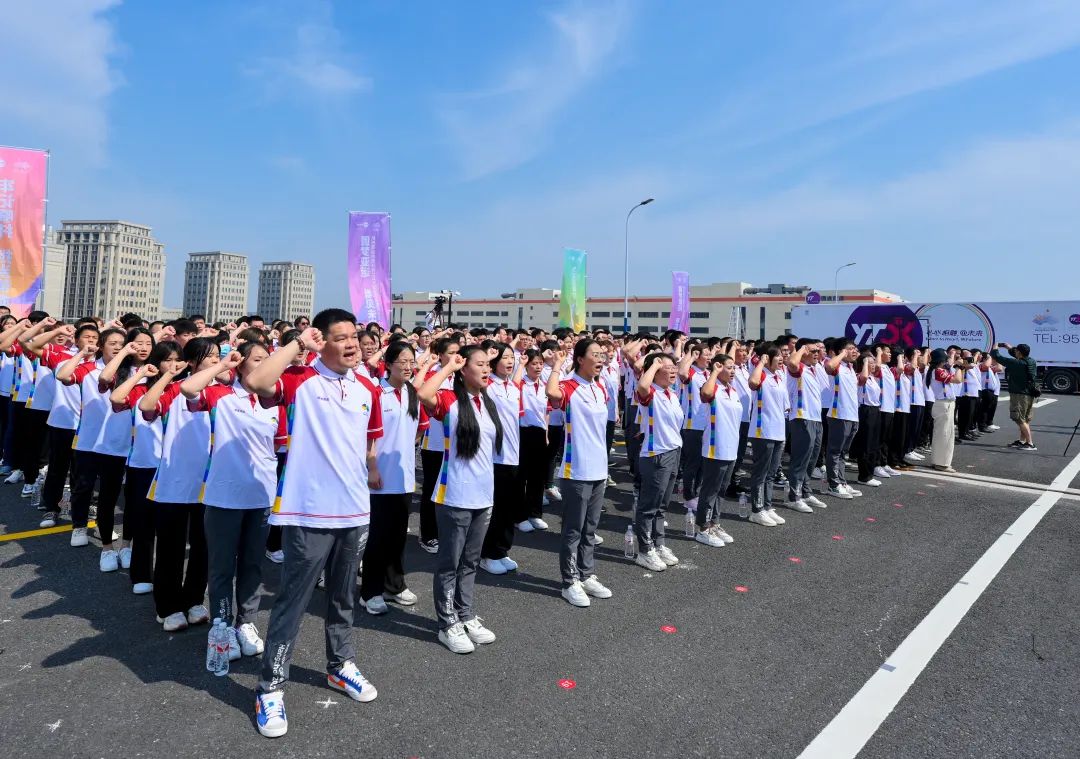 二樓平臺(tái)上,300余名圓通“快遞小哥”舉行“杭州亞運(yùn)會(huì)倒計(jì)時(shí)百天誓師動(dòng)員大會(huì)”,齊整響亮的誓言回蕩在物流中心上空,“百日沖刺”的鼓點(diǎn)激蕩著每個(gè)人的內(nèi)心。