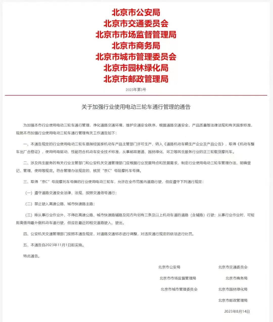 8月18日晚,北京市公安局、交通委、市場(chǎng)監(jiān)管局、商務(wù)局、城市管理委、園林綠化局、郵政管理局七部門聯(lián)合發(fā)布《關(guān)于加強(qiáng)行業(yè)使用電動(dòng)三輪車通行管理的通告》(以下簡(jiǎn)稱《通告》),明確民生服務(wù)行業(yè)使用電動(dòng)三輪車的通行管理規(guī)定,將對(duì)郵政寄遞、園林綠化、環(huán)衛(wèi)等民生服務(wù)行業(yè)的車輛核發(fā)“京C”號(hào)段摩托車車牌,使用這些車輛的駕駛?cè)吮仨毧既∧ν熊囻{駛證,確保做到上路車輛“人持證、車上牌”。