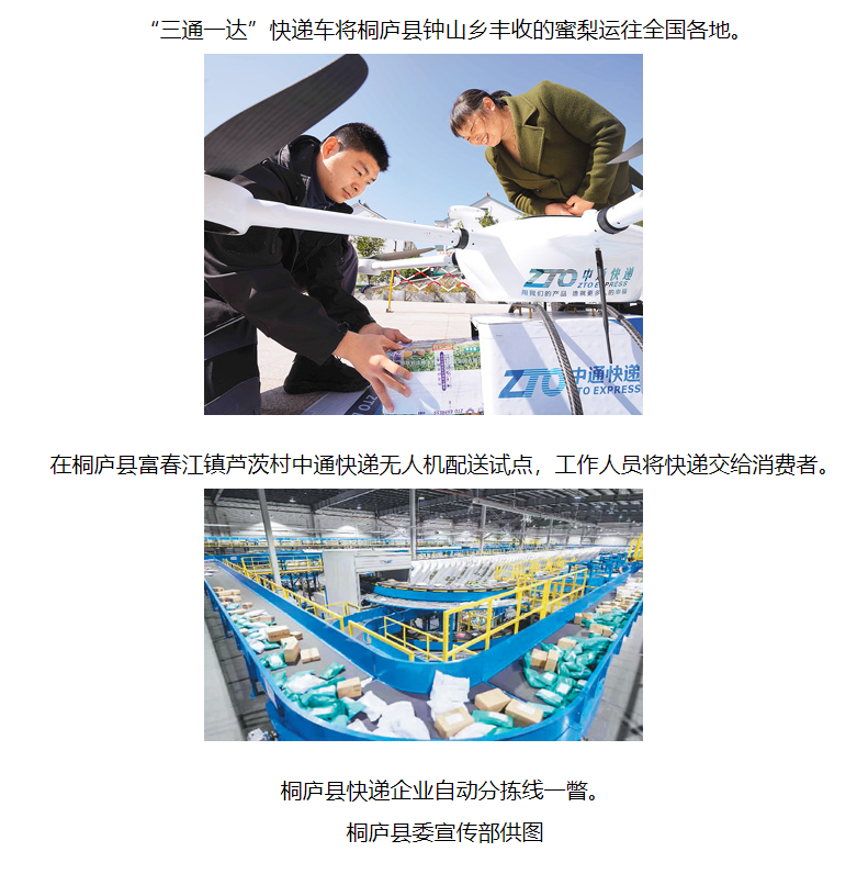 每到鐘山鄉(xiāng)蜜梨成熟的時節(jié),“三通一達”快遞專車便將采摘好的蜜梨運到全國各地;在百江鎮(zhèn),中通快遞、圓通速遞攜手構建冷鏈運輸模式,助力百江蔬菜“走出去”;在子胥村,快遞人先后捐資興建道路以及綜合樓、大禮堂和公共食堂等……良好的營商環(huán)境和日益完善的公共設施,吸引著“三通一達”在桐廬進行多元投資,造福桑梓。
