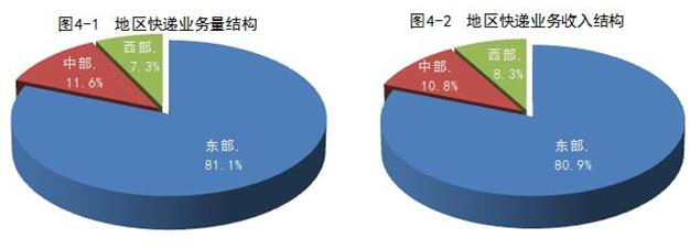 1-10月,東、中、西部地區(qū)快遞業(yè)務(wù)量比重分別為81.1%、11.6%和7.3%,業(yè)務(wù)收入比重分別為80.9%、10.8%和8.3%。與去年同期相比,東部地區(qū)快遞業(yè)務(wù)量比重上升了0.1個(gè)百分點(diǎn),快遞業(yè)務(wù)收入比重下降了0.2個(gè)百分點(diǎn);中部地區(qū)快遞業(yè)務(wù)量比重下降了0.3個(gè)百分點(diǎn),快遞業(yè)務(wù)收入比重上升了0.1個(gè)百分點(diǎn);西部地區(qū)快遞業(yè)務(wù)量比重上升了0.2個(gè)百分點(diǎn),快遞業(yè)務(wù)收入比重上升了0.1個(gè)百分點(diǎn)。