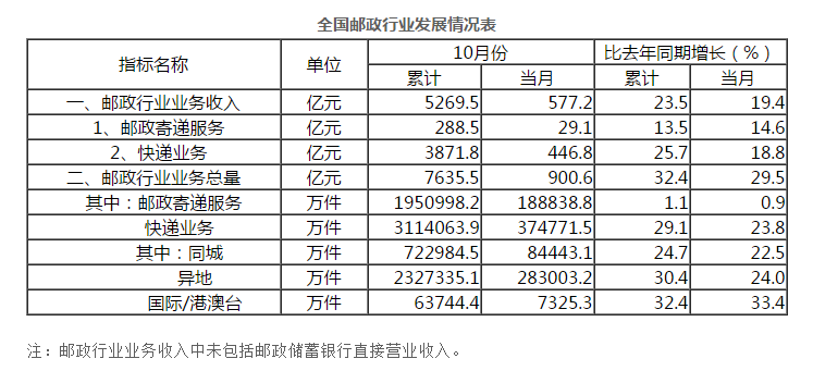 10月份,全行業(yè)業(yè)務(wù)收入完成577.2億元,同比增長(zhǎng)19.4%;業(yè)務(wù)總量完成900.6億元,同比增長(zhǎng)29.5%。