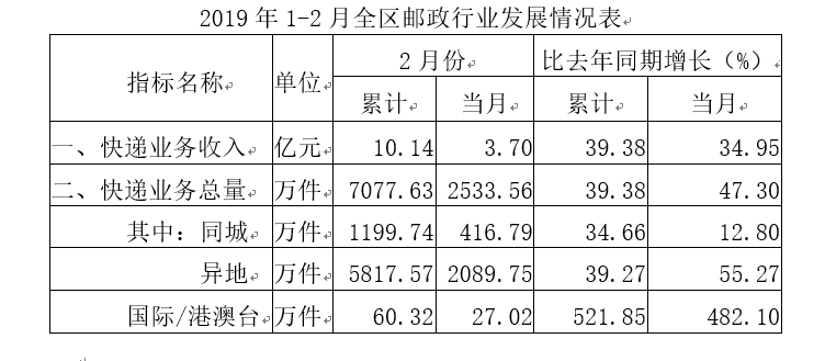 2019年2月廣西自治區(qū)郵政行業(yè)運(yùn)行情況