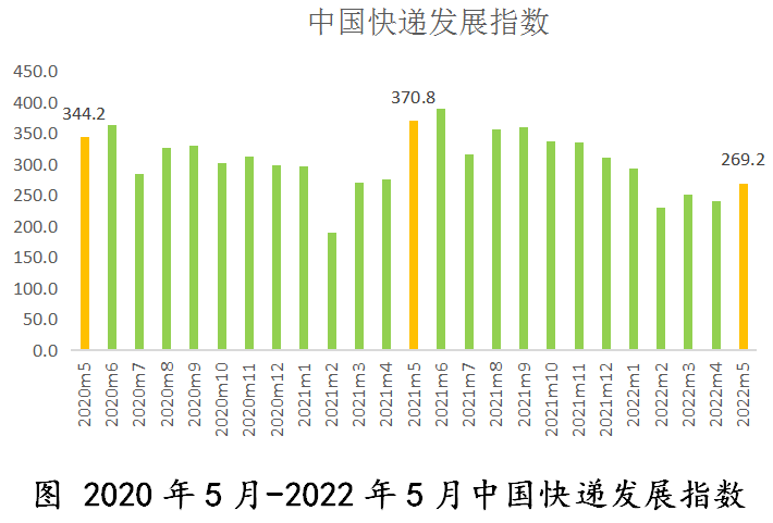6月3日,國(guó)家郵政局發(fā)布2022年5月中國(guó)快遞發(fā)展指數(shù)報(bào)告。經(jīng)測(cè)算,2022年5月中國(guó)快遞發(fā)展指數(shù)為269.2,環(huán)比上升11.6%。其中發(fā)展規(guī)模指數(shù)、服務(wù)質(zhì)量指數(shù)、發(fā)展能力指數(shù)和發(fā)展趨勢(shì)指數(shù)分別為344.7、331.7、198.4和67.2,環(huán)比分別上升20.3%、2.1%、16%和2.4%。相比4月份,行業(yè)規(guī)模有效恢復(fù),質(zhì)效得到改善,保通保暢工作成效明顯。