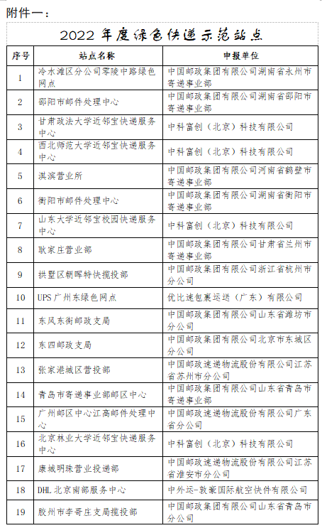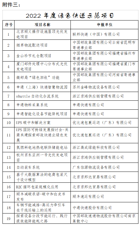 根據(jù)《中國快遞協(xié)會關(guān)于開展綠色快遞示范案例征集活動的通知》(中快協(xié)〔2022〕11號)安排,經(jīng)過公開征集、網(wǎng)絡(luò)公示和投票、專家審定等環(huán)節(jié),中國郵政集團有限公司湖南省永州市寄遞事業(yè)部申報的冷水灘區(qū)分公司零陵中路綠色網(wǎng)點等26個站點入選為2022年度綠色快遞示范站點;山聯(lián)(長興)新材料股份有限公司申報的MU?無機降解薄膜膠帶等26個產(chǎn)品入選為2022年度綠色快遞示范產(chǎn)品;聯(lián)邦快遞(中國)有限公司申報的北京順義操作設(shè)施屋頂光伏發(fā)電項目等22個項目入選為2022年度綠色快遞示范項目。(具體征集結(jié)果見附件)