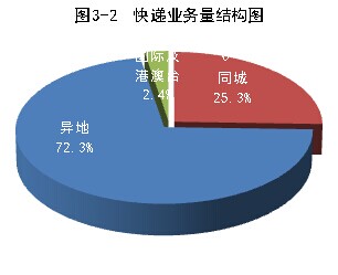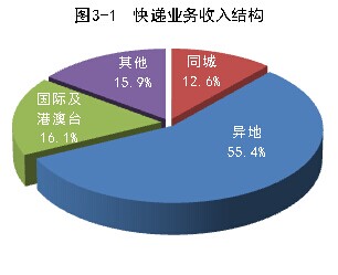 1-7月份,同城、異地、國(guó)際及港澳臺(tái)快遞業(yè)務(wù)收入分別占全部快遞收入的12.6%、55.4%和16.1%;業(yè)務(wù)量分別占全部快遞業(yè)務(wù)量的25.3%、72.3%和2.4%。與去年同期相比,同城快遞業(yè)務(wù)收入的比重上升1.1個(gè)百分點(diǎn),異地快遞業(yè)務(wù)收入的比重下降1個(gè)百分點(diǎn),國(guó)際及港澳臺(tái)業(yè)務(wù)收入的比重下降了4.2個(gè)百分點(diǎn)。