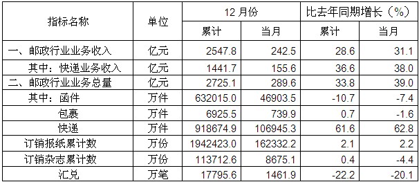 12月份,全行業(yè)業(yè)務(wù)收入完成242.5億元,同比增長(zhǎng)31.1%;業(yè)務(wù)總量完成289.6億元,同比增長(zhǎng)39%。