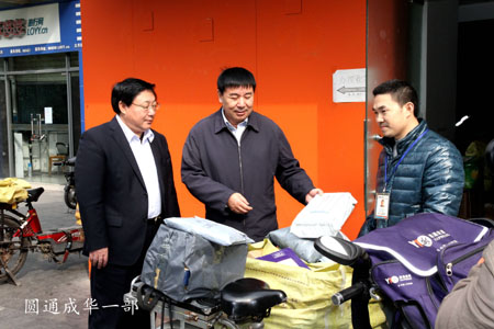 次日,李惠德帶領(lǐng)督導(dǎo)組一行到成都各快遞公司服務(wù)網(wǎng)點(diǎn)對(duì)配送情況進(jìn)行檢查。從繁華的市中心到較為偏遠(yuǎn)的郊區(qū),督導(dǎo)組共檢查了10家快遞公司的11個(gè)投遞網(wǎng)點(diǎn)(順豐華陽(yáng)點(diǎn)部、申通東一區(qū)營(yíng)業(yè)部和華陽(yáng)營(yíng)業(yè)部、圓通成華一部、韻達(dá)華陽(yáng)服務(wù)站、中通華陽(yáng)營(yíng)業(yè)部、百世匯通華陽(yáng)分部、宅急送華陽(yáng)操作點(diǎn)、天天華陽(yáng)營(yíng)業(yè)部、國(guó)通華陽(yáng)分部、京東李家沱站)。檢查中,李惠德重點(diǎn)向各網(wǎng)點(diǎn)負(fù)責(zé)人詢問(wèn)了近幾天的業(yè)務(wù)量增長(zhǎng)情況,各投遞道段投送頻次和數(shù)量,派件費(fèi)是否到位、標(biāo)準(zhǔn)是多少,員工收入能達(dá)到多少,同時(shí)檢查了現(xiàn)場(chǎng)有無(wú)積壓等,并要求網(wǎng)點(diǎn)必須做好快件的安全保障,避免積壓,囑咐他們要關(guān)心員工的生活,要保障員工的利益等等。隨后,督導(dǎo)組聽(tīng)取了四川省郵政管理局的旺季工作匯報(bào)。