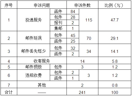 10月,受理消費者關(guān)于郵政服務(wù)問題的有效申訴241件,比上月減少29件,下降10.7%。其中,投遞服務(wù)問題115件,占47.7%;郵件延誤70件,占29.1%;郵件丟失及內(nèi)件短少34件,占14.1%;收寄服務(wù)問題14件,占5.8%;郵件損毀3件,占1.2%;違規(guī)收費3件,占1.2%;其他問題2件,占0.8%。