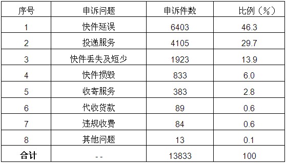 10月,受理消費者關(guān)于快遞業(yè)務(wù)的有效申訴13833件。比上月減少174件,下降1.2%。其中,快件延誤6403件,占46.3%;投遞服務(wù)問題4105件,占29.7%;快件丟失及內(nèi)件短少1923件,占13.9%;快件損毀833件,占6%;收寄服務(wù)問題383件,占2.8%;代收貨款問題89件,占0.6%;違規(guī)收費84件,占0.6%;其他問題13件,占0.1%。