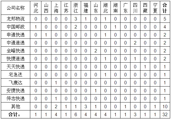 2013年10月,快遞企業(yè)對省(區(qū)、市)郵政管理局轉(zhuǎn)辦的申訴未能按規(guī)定時限回復(fù)的有32件。