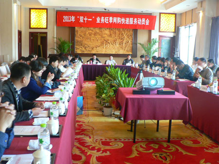 為貫徹落實(shí)國家郵政局馬軍勝局長(zhǎng)在部署群眾路線教育實(shí)踐活動(dòng)下一階段工作會(huì)議上的講話精神,10月25日,中國快遞協(xié)會(huì)召集快遞企業(yè)和電商平臺(tái),在浙江杭州召開2013年“雙11”業(yè)務(wù)旺季快遞服務(wù)動(dòng)員大會(huì),動(dòng)員部署快遞旺季服務(wù)保障工作,協(xié)調(diào)解決快遞與電子商務(wù)在業(yè)務(wù)對(duì)接方面存在的瓶頸,切實(shí)保障“雙11”期間快遞服務(wù)的平穩(wěn)運(yùn)行。國家郵政局市場(chǎng)監(jiān)管司、新聞宣傳中心、消費(fèi)者申訴中心、部分?。▍^(qū)、市)快遞行業(yè)協(xié)會(huì)等部門參加了本次會(huì)議。