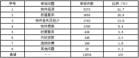 6月,受理消費者關(guān)于快遞業(yè)務(wù)的有效申訴12634件。比上月減少1477件,下降10.5%。其中,快件延誤5273件,占41.7%;投遞服務(wù)問題3655件,占28.9%;快件丟失及內(nèi)件短少1743件,占13.8%;快件損毀1059件,占8.4%;收寄服務(wù)問題438件,占3.5%;代收貨款問題248件,占2%;違規(guī)收費199件,占1.6%;其他問題19件,占0.2%。