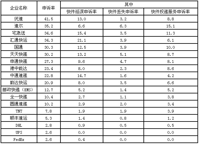 (二)消費者對快遞企業(yè)申訴情況