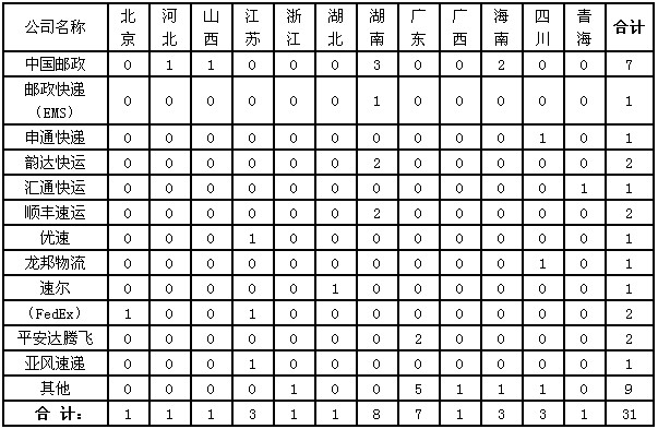 2013年6月,快遞企業(yè)對?。▍^(qū)、市)郵政管理局轉(zhuǎn)辦的申訴未能按規(guī)定時限回復(fù)的有31件。