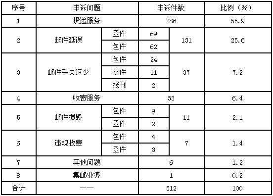 3月,受理消費(fèi)者關(guān)于郵政服務(wù)問(wèn)題的有效申訴512件,比上月減少36件,下降6.6%。其中,投遞服務(wù)問(wèn)題286件,占55.9%;郵件延誤131件,占25.6%;郵件丟失及內(nèi)件短少37件,占7.2%;收寄服務(wù)問(wèn)題33件,占6.4%;郵件損毀11件,占2.1%;違規(guī)收費(fèi)7件,占1.4%;集郵問(wèn)題1件,占0.2%;其他問(wèn)題6件,占1.2%。
