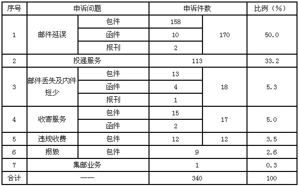 12月,受理消費(fèi)者關(guān)于郵政服務(wù)問(wèn)題的有效申訴340件,比上月增加137件,增長(zhǎng)67.5%。其中,反映郵件延誤的170件,占50.0%;反映投遞服務(wù)問(wèn)題的113件,占33.2%;反映郵件丟失及內(nèi)件短少的18件,占5.3%;反映收寄服務(wù)問(wèn)題的17件,占5.0%;反映違規(guī)收費(fèi)的12件,占3.5%;反映郵件損毀的9件,占2.6%;反映集郵問(wèn)題的1件,占0.3%。