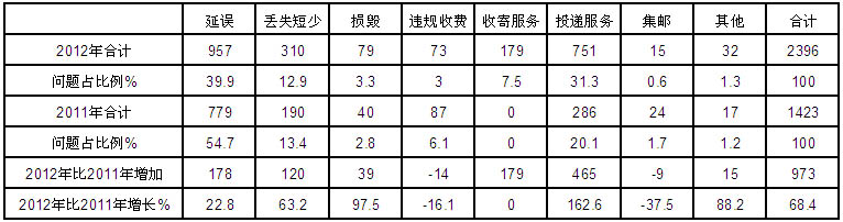 2012年共受理郵政服務(wù)有效申訴2396件,占全部有效申訴量的1.7%,比2011年增加973件,增長(zhǎng)68.4%。