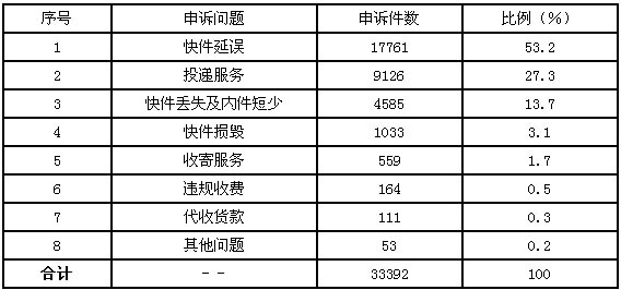 12月,受理消費(fèi)者關(guān)于快遞業(yè)務(wù)的有效申訴33392件,比上月增加17389件,增長(zhǎng)108.7%。其中,反映快件延誤的17761件,占53.2%;反映投遞服務(wù)問(wèn)題的9126件,占27.3%;反映快件丟失及內(nèi)件短少的4585件,占13.7%;反映快件損毀的1033件,占3.1%;反映收寄服務(wù)問(wèn)題的559件,占1.7%;反映違規(guī)收費(fèi)的164件,占0.5%;反映代收貨款問(wèn)題的111件,占0.3%;反映其他問(wèn)題的53件,占0.2%。