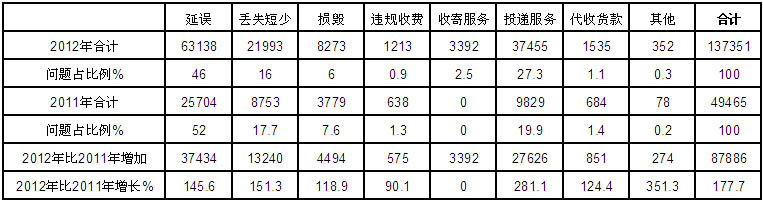 2012年共受理快遞業(yè)務(wù)有效申訴137351件,占全部有效申訴量的98.3%,比2011年增加87886件,增長(zhǎng)177.7%。