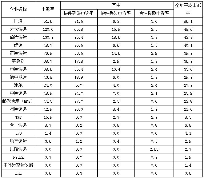 12月,消費(fèi)者對(duì)46家快遞企業(yè)進(jìn)行了有效申訴,全國(guó)快遞業(yè)務(wù)平均百萬(wàn)件快件有效申訴50.9件。