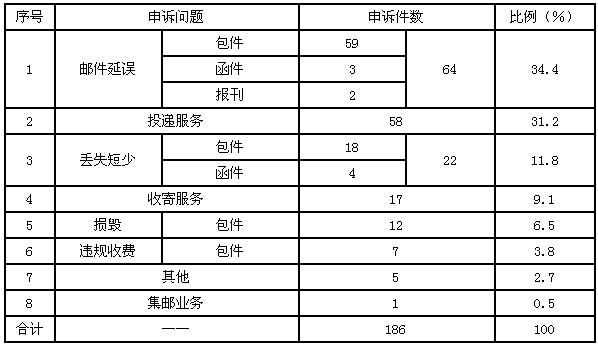 7月,受理消費者關于郵政服務問題的有效申訴186件,比上月增加62件,增長50%。其中,反映郵件延誤的64件,占34.4%;反映投遞服務問題的58件,占31.2%;反映郵件丟失及內(nèi)件短少的22件,占11.8%;反映收寄服務問題的17件,占9.1%;反映郵件損毀的12件,占6.5%;反映違規(guī)收費的7件,占3.8%;反映其他問題的5件,占2.7%;反映集郵問題的1件,占0.5%。