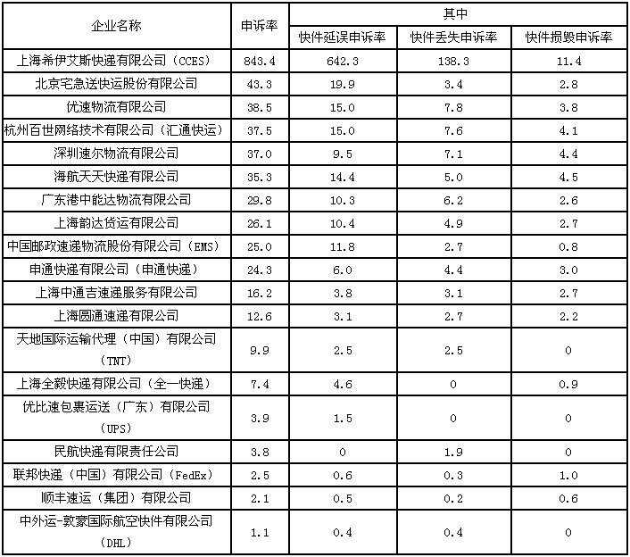 7月,消費者對41家快遞企業(yè)進行了有效申訴,全國快遞業(yè)務平均百萬件快件有效申訴19.9件。