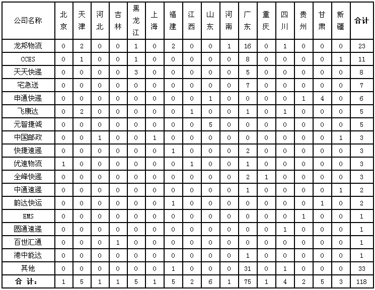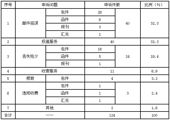 6月,受理消費者關(guān)于郵政服務(wù)問題的有效申訴124件,比上月減少12件,下降8.8%。其中,反映郵件延誤的40件,占32.3%;反映投遞服務(wù)問題的40件,占32.3%;反映郵件丟失及內(nèi)件短少的24件,占19.4%;反映收寄服務(wù)問題的11件,占8.9%;反映郵件損毀的4件,占3.2%;反映違規(guī)收費的3件,占2.4%;反映其他問題的2件,占1.6%。