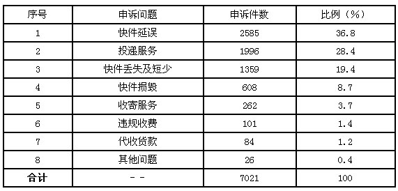 6月,受理消費者關(guān)于快遞業(yè)務(wù)的有效申訴7021件,比上月減少1401件,下降16.6%。其中,反映快件延誤的2585件,占36.8%;反映投遞服務(wù)問題的1996件,占28.4%;反映快件丟失及內(nèi)件短少的1359件,占19.4%;反映快件損毀的608件,占8.7%;反映收寄服務(wù)問題的262件,占3.7%;反映違規(guī)收費的101件,占1.4%;反映代收貨款問題的84件,占1.2%;反映其他問題的26件,占0.4%。