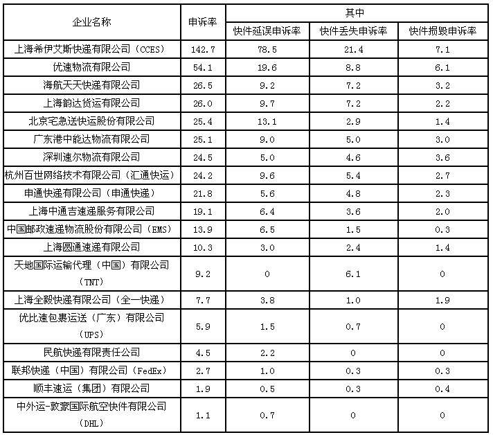6月,消費者對41家快遞企業(yè)進行了有效申訴,全國快遞業(yè)務(wù)平均百萬件快件有效申訴15.5件。