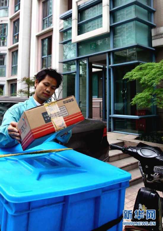 5月1日,一名快遞員在上海一居民小區(qū)為顧客遞送快遞??爝f服務(wù)系列國家標(biāo)準(zhǔn)當(dāng)日起正式實(shí)施。 新華社記者 陳飛 攝