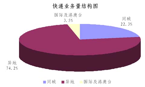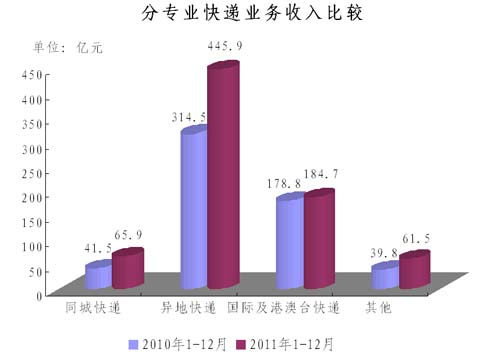2011年,全國(guó)規(guī)模以上快遞服務(wù)企業(yè)業(yè)務(wù)量累計(jì)完成36.7億件,同比增長(zhǎng)57.0%;業(yè)務(wù)收入累計(jì)完成758億元,同比增長(zhǎng)31.9%。其中,同城業(yè)務(wù)收入累計(jì)完成65.9億元,同比增長(zhǎng)58.8%;異地業(yè)務(wù)收入累計(jì)完成445.9億元,同比增長(zhǎng)41.8%;國(guó)際及港澳臺(tái)業(yè)務(wù)收入累計(jì)完成184.7億元,同比增長(zhǎng)3.3%。