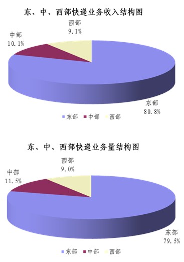 1-10月,東、中、西部地區(qū)快遞業(yè)務(wù)收入的比重分別為80.8%、10.1%和9.1%,業(yè)務(wù)量比重分別為79.5%、11.5%和9.0%。與去年同期相比,東部地區(qū)快遞業(yè)務(wù)收入比重下降了0.5個(gè)百分點(diǎn),快遞業(yè)務(wù)量比重上升了0.3個(gè)百分點(diǎn);中部地區(qū)快遞業(yè)務(wù)收入比重上升了0.3個(gè)百分點(diǎn),快遞業(yè)務(wù)量比重下降了0.2個(gè)百分點(diǎn);西部地區(qū)快遞業(yè)務(wù)收入比重上升了0.2個(gè)百分點(diǎn),快遞業(yè)務(wù)量比重下降了0.1個(gè)百分點(diǎn)。