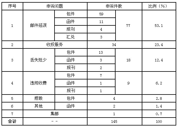 9月,受理消費(fèi)者關(guān)于郵政服務(wù)問(wèn)題的有效申訴145件,比上月增加53件,增長(zhǎng)57.6%。其中,反映郵件延誤的77件,占53.1%;反映收投服務(wù)問(wèn)題的34件,占23.4%;反映郵件丟失及內(nèi)件短少的18件,占12.4%;反映違規(guī)收費(fèi)的9件,占6.2%;反映郵件損毀的4件,占2.8%;反映其他問(wèn)題的2件,占1.4%;反映集郵問(wèn)題的1件,占0.7%。