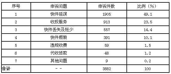9月,受理消費(fèi)者關(guān)于快遞業(yè)務(wù)的有效申訴3882件。比上月增加1100件,增長(zhǎng)39.5%。其中,反映快件延誤的1905件,占49.1%;反映收投服務(wù)問(wèn)題的913件,占23.5%;反映快件丟失及內(nèi)件短少的557件,占14.4%;反映快件損毀的391件,占10.1%;反映違規(guī)收費(fèi)問(wèn)題的59件,占1.5%;反映代收貨款問(wèn)題的48件,占1.2%;反映其他問(wèn)題的9件,占0.2%。