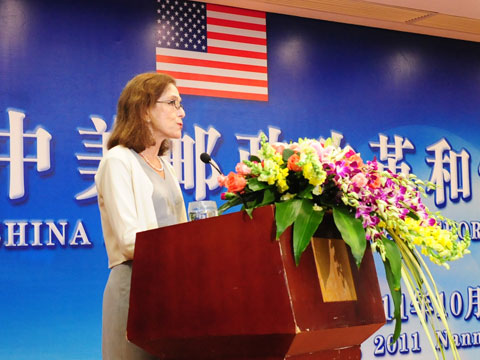 圖為美國郵政監(jiān)管委員會主席金薇女士致辭。