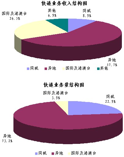 1-7月,同城、異地、國際及港澳臺快遞業(yè)務收入分別占全部快遞收入的8.9%、57.7%和26.5%;業(yè)務量分別占全部快遞業(yè)務量的22.9%、73.2%和3.9%。與去年同期相比,同城快遞業(yè)務收入的比重上升1.9個百分點,異地快遞業(yè)務收入的比重上升3.3個百分點,國際及港澳臺業(yè)務收入的比重下降了5.5個百分點。