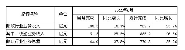 上半年,全行業(yè)業(yè)務(wù)總量(按2010年不變單價計算)累計完成770.8億元,同比增長25.2%,比去年同期提高4.3個百分點;實現(xiàn)業(yè)務(wù)收入(不包括郵政儲蓄銀行直接營業(yè)收入)782.7億元,同比增長23.7%,比去年同期提高3.7個百分點。