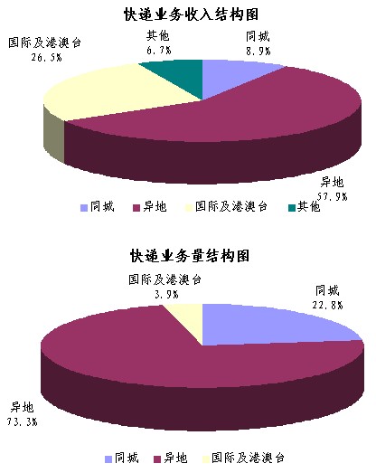 上半年,同城、異地、國際及港澳臺快遞業(yè)務收入分別占全部快遞收入的8.9%、57.9%和26.5%;業(yè)務量分別占全部快遞業(yè)務量的22.8%、73.3%和3.9%。與去年同期相比,同城快遞業(yè)務收入的比重上升2個百分點,異地快遞業(yè)務收入的比重上升3.6個百分點,國際及港澳臺業(yè)務收入的比重下降了5.5個百分點。