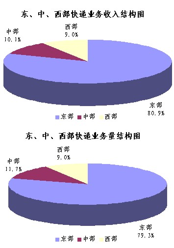 上半年,東、中、西部地區(qū)快遞業(yè)務收入的比重分別為80.9%、10.1%和9.0%,業(yè)務量比重分別為79.3%、11.7%和9.0%。與去年同期相比,東部地區(qū)快遞業(yè)務收入比重下降了0.4個百分點,快遞業(yè)務量比重下降了1.0個百分點;中部地區(qū)快遞業(yè)務收入比重上升了0.2個百分點,快遞業(yè)務量比重上升了1.1個百分點;西部地區(qū)快遞業(yè)務收入比重上升了0.2個百分點,快遞業(yè)務量比重下降了0.1個百分點。