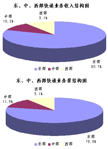 1-4月,東、中、西部地區(qū)快遞業(yè)務(wù)收入的比重分別為80.7%、10.2%和9.1%,業(yè)務(wù)量比重分別為79.0%、11.9%和9.1%。與去年同期相比,東部地區(qū)快遞業(yè)務(wù)收入比重下降了0.7個百分點(diǎn),快遞業(yè)務(wù)量比重下降了1.7個百分點(diǎn);中部地區(qū)快遞業(yè)務(wù)收入比重上升了0.4個百分點(diǎn),快遞業(yè)務(wù)量比重上升了1.7個百分點(diǎn);西部地區(qū)快遞業(yè)務(wù)收入比重上升了0.3個百分點(diǎn),快遞業(yè)務(wù)量比重與去年同期持平。