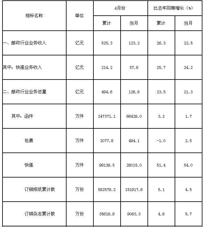 國家郵政局公布2011年4月份郵政行業(yè)運(yùn)行情況