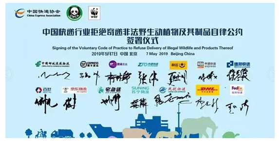2019年5月7日,中國郵政速遞、順豐、申通、圓通、中通、韻達(dá)、百世、德邦、宅急送、京東物流、蘇寧物流、民航快遞以及DHL、FedEx,共14家國內(nèi)外快遞企業(yè)共同簽署了快遞業(yè)拒絕寄遞非法野生動植物及其制品自律公約(以下簡稱《自律公約》)。此次活動由中國快遞協(xié)會(CEA)、世界自然基金會(WWF)和中國野生動物保護協(xié)會(CWCA)聯(lián)合主辦,各企業(yè)并承諾采取各種有效措施,拒絕收寄非法野生動植物及其制品,積極遏制野生動植物非法貿(mào)易,保護野生動植物資源和生物多樣性。