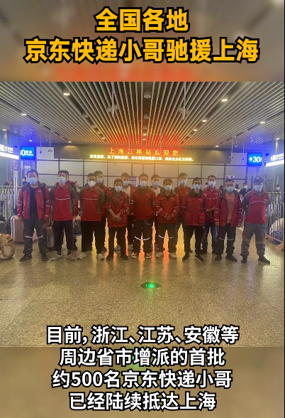 京東物流在全國(guó)范圍內(nèi)招募并調(diào)集快遞員前往上海增援,浙江、江蘇、安徽等周邊省市增派的首批約500名京東小哥已經(jīng)陸續(xù)抵達(dá)上海。