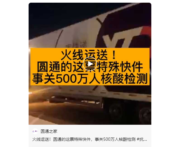 圓通22小時(shí)緊急送達(dá)材料 事關(guān)500萬(wàn)人的核酸檢測(cè)