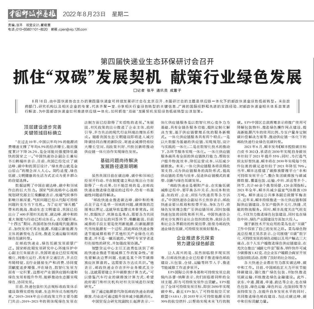 8月18日,由中國(guó)快遞協(xié)會(huì)主辦的第四屆快遞業(yè)可持續(xù)發(fā)展研討會(huì)在北京召開(kāi),本屆研討會(huì)的主題是供應(yīng)鏈一體化下的郵政快遞業(yè)綠色低碳轉(zhuǎn)型。來(lái)自政府部門(mén)、研究機(jī)構(gòu)以及相關(guān)企業(yè)的專家、代表齊聚一堂,分享相關(guān)行業(yè)綠色轉(zhuǎn)型的關(guān)鍵信息、廣闊的國(guó)際視野和先進(jìn)的實(shí)踐經(jīng)驗(yàn),對(duì)郵政快遞業(yè)相關(guān)體系政策進(jìn)行解讀,為中國(guó)郵政快遞業(yè)如何推進(jìn)供應(yīng)鏈一體化、如何抓住“雙碳”發(fā)展契機(jī)實(shí)現(xiàn)綠色低碳轉(zhuǎn)型出謀劃策。