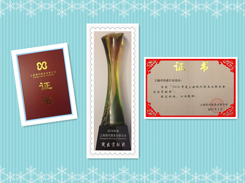 上海市快遞行業(yè)協(xié)會(huì) 榮獲“上?,F(xiàn)代服務(wù)業(yè)聯(lián)合會(huì)2016年度特殊貢獻(xiàn)獎(jiǎng)”